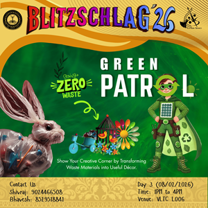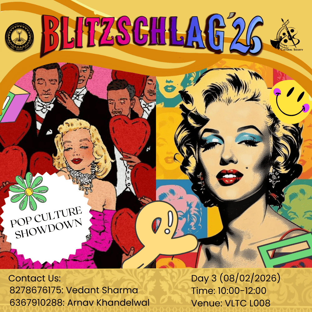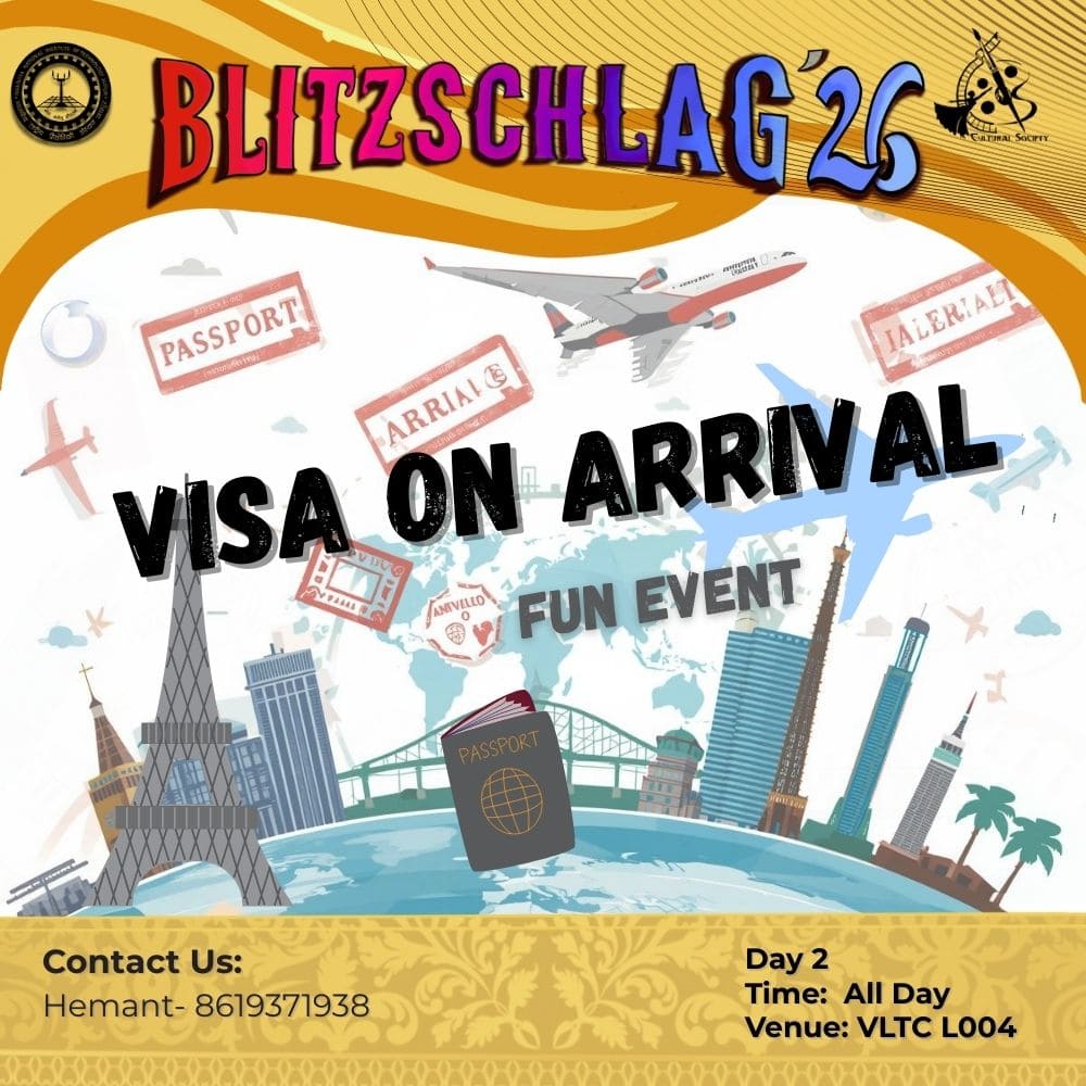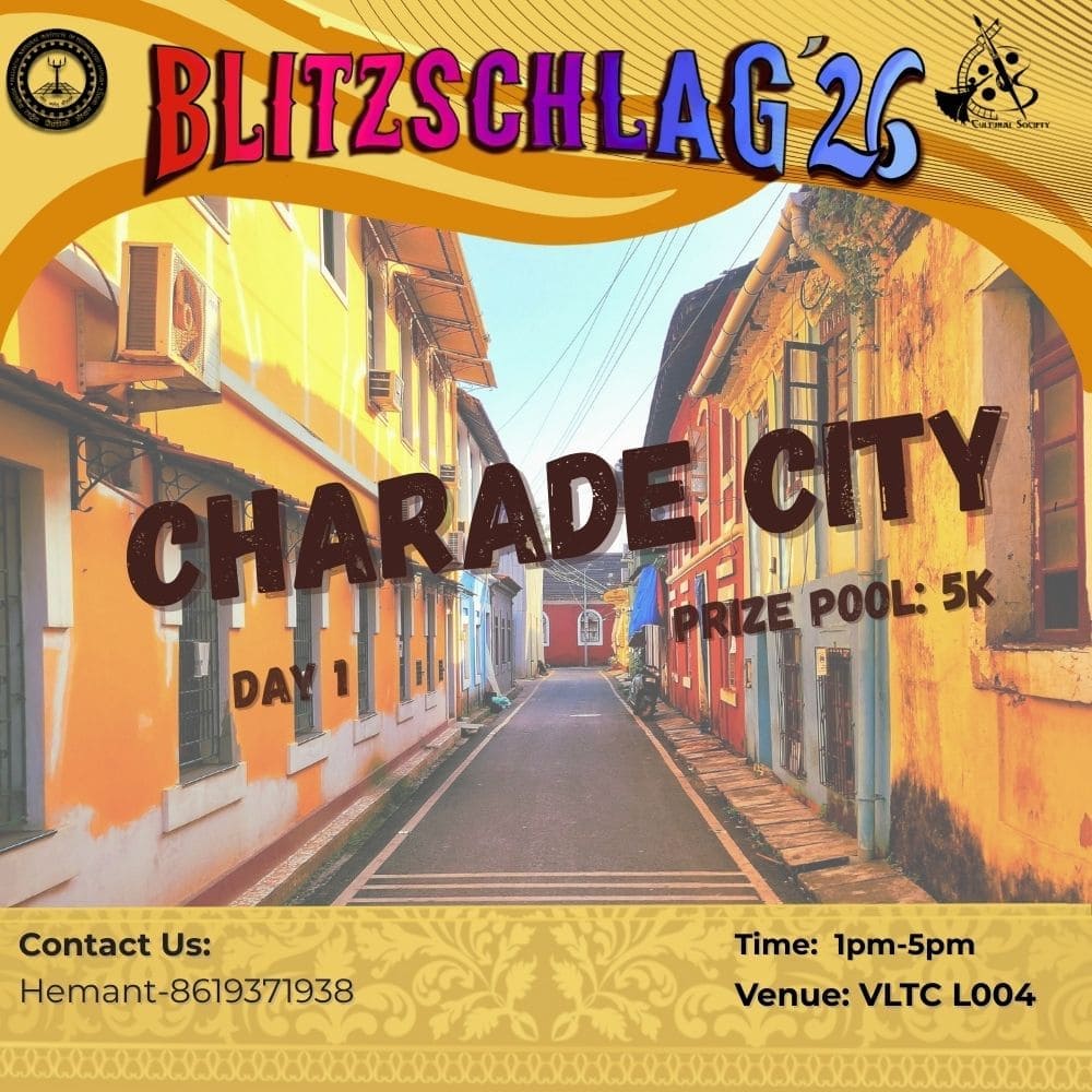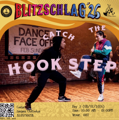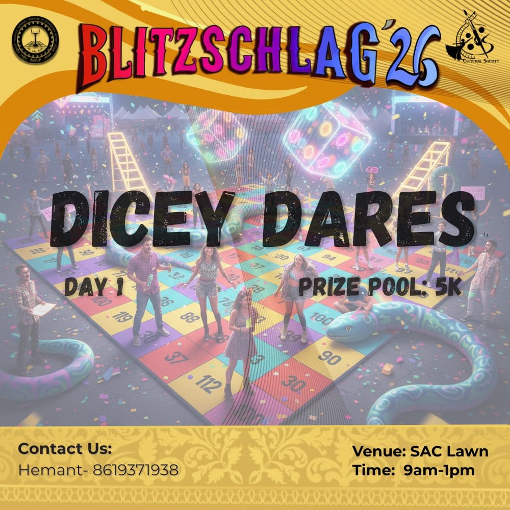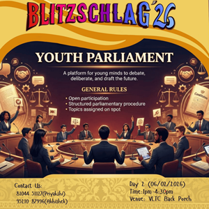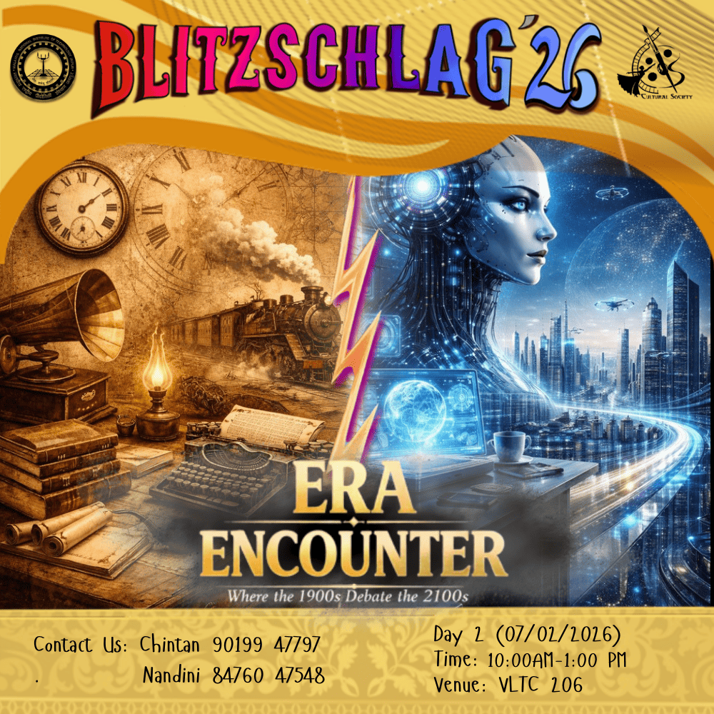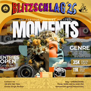 Parade throughout the campus from VLTC FP to OAT to Prabha Bhawan and then Inauguration of Blitz '26. It will be showcasing India’s diverse cultures and traditions. Other clubs (Drama, Music, Dance, Fashion, Creative Arts) will show some talent at different places (VLTC FP, OAT, Prabha Bhawan).