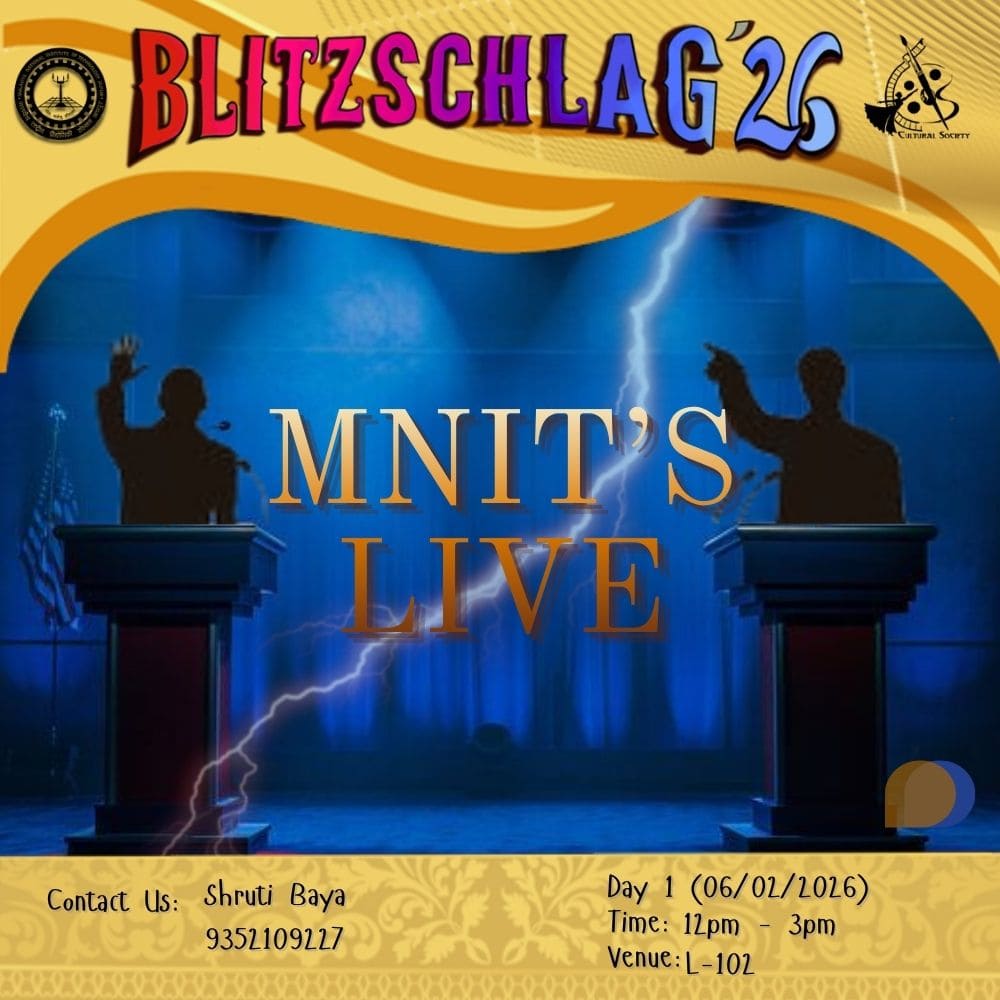 MNIT’s Live is an exciting and interactive debate event designed to test participants’ spontaneity, creativity, and communication skills in a fun and friendly environment. Participants compete in teams on light-hearted and engaging topics that are revealed on the spot. Each debate features two teams of three members (3 vs 3), promoting teamwork, quick thinking, and effective expression within a fixed time limit. Speakers are expected to present sharp arguments and respectful rebuttals while ensuring equal participation among all team members. The event strongly emphasizes fair play, mutual respect, and clean communication, making it an enjoyable and enriching experience for both participants and the audience. Teams are evaluated based on content quality, creativity, clarity of expression, teamwork, and overall impact.
